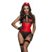 М’який матеріал боді з дрібної сіточки гарно облягає тіло. Ліф оригінального крою із зав’язками на шиї ззаду має приголомшливо спокусливий вигляд. Червоний корсет з матеріалу з мокрим ефектом та кнопками спереду чудово тримає форму завдяки кісточкам та підкреслює талію. Широкі пестис червоного кольору добре липнуть до сосків. Наліпки добре проглядаються крізь напівпрозору тканину боді, дражнячи недомовленістю. Акуратні короткі рукавички з дрібної сіточки ніжно закривають кисть. Панчохи у велику сітку — універсальний безпрограшний аксесуар, який можна сміливо вдягнути під будь-яке вбрання або костюм. Червона шапочка з білим хрестом доповнює образ медсестри-спокусниці.