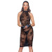 Воротник-халтер на застежках-крючках на шее оставляет плечи мило открытыми. Большой вырез спинки украшают шесть декоративных тонких лент. Они смотрятся идеально на обнаженном теле. Длина платья до колена и эластичный материал не стесняют движения.